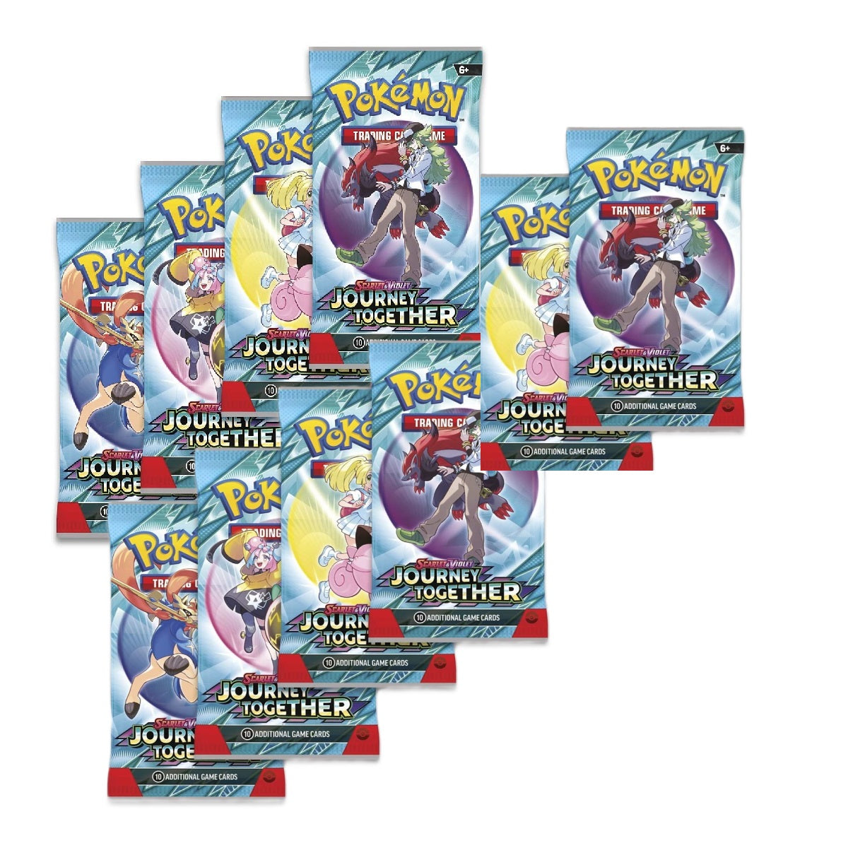 Du får 10 booster-pakker fra den nye Pokémon Scarlet & Violet - Journey Together (SV9) udvidelse som vil udkomme i slutning af marts 2025. OBS: Sammensætning af boosters er udvalgt tilfældigt.